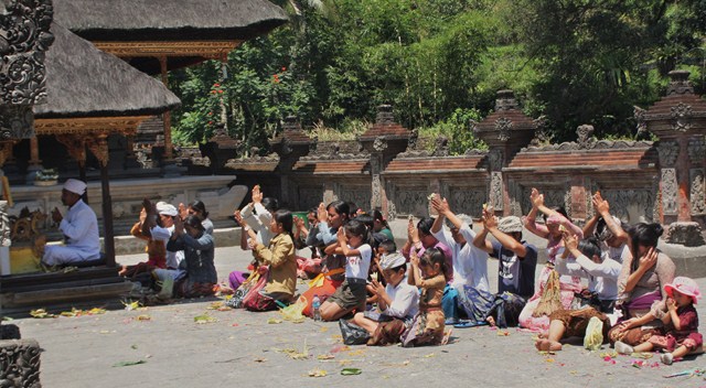 Vu le travail minutieux nécessité par ces décorations tous les membres de la famille doivent certainement s’y mettre et y passer tout leur temps ! En tout cas ils ont l’air très affairés mais très heureux de le faire, les plus jeunes comme les plus âgés. Le jour même de la fête de Galungan ils vont porter des offrandes au temple public et prier. Nous avons pu visiter plusieurs temples publics ainsi décorés et avons entrevu par les portes certains sanctuaires privés. Un matin  une dame très gentille nous a invités à venir dans son temple privé. Mais à Ubud nous n’avons pas vu comme à Lembongan les gens se réunir en grand nombre dans les temples publics pour prier ensemble : ici cela semblait plutôt être une fête religieuse familiale.